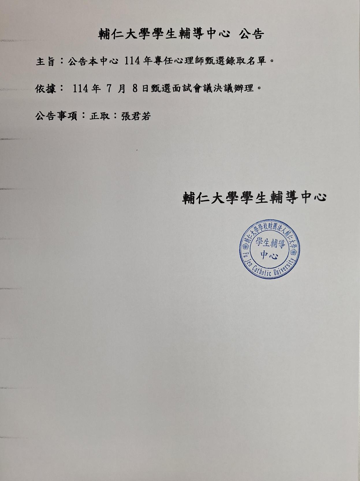 主旨:公告本中心 114 年專任心理師甄選錄取名單。